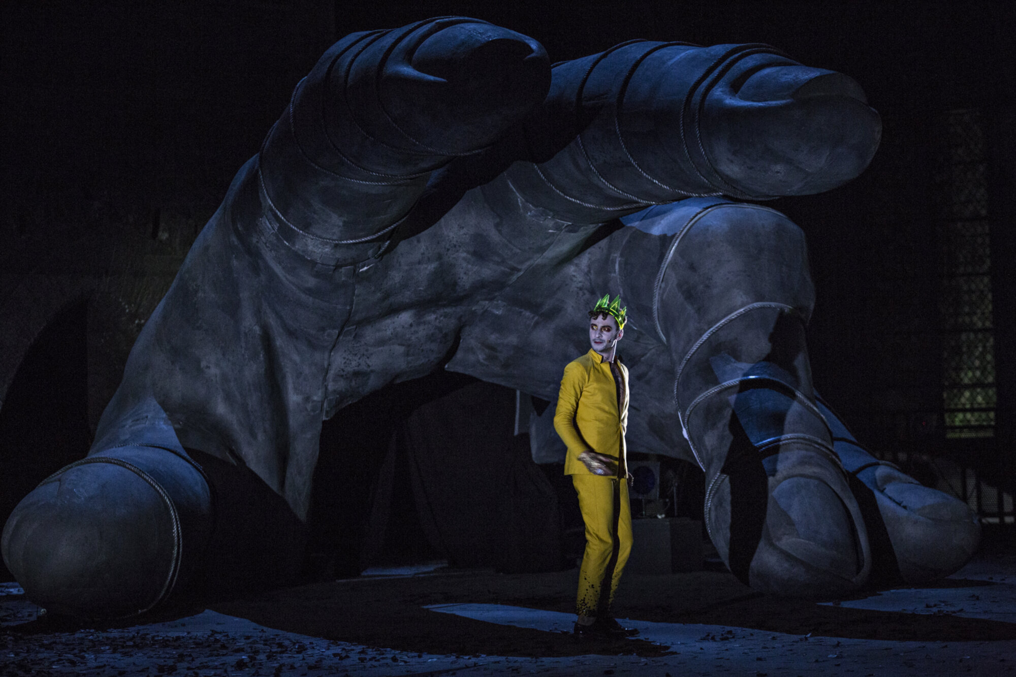 Prenez maintenant la mise en scène. Grandiose : le décor est dominé par les monumentales tête, statufiée dans une expression de terreur, et main, tendue vers l’objet du supplice – et vers nous – de Tantale, renversées sur le côté, qui culminent jusqu’à quatre mètres de haut. Des cordes les entourent et, comme nous le découvrirons plus tard, des guirlandes de lumières blanches. L’atmosphère est lourde, chargée d’une fumée diffuse. Les premières scènes vous glacent vraiment le sang : Tantale semble une chose visqueuse et verdâtre qui vous regarde comme un possédé, tandis que la voix rauque quasi saturée de la Harpie prononce une sentence avec une force implacable. Des créatures sournoises se faufilent sur les éléments du décor, avec leurs visages grimés façon corpse paint d’où pendouillent des lambeaux rouges.