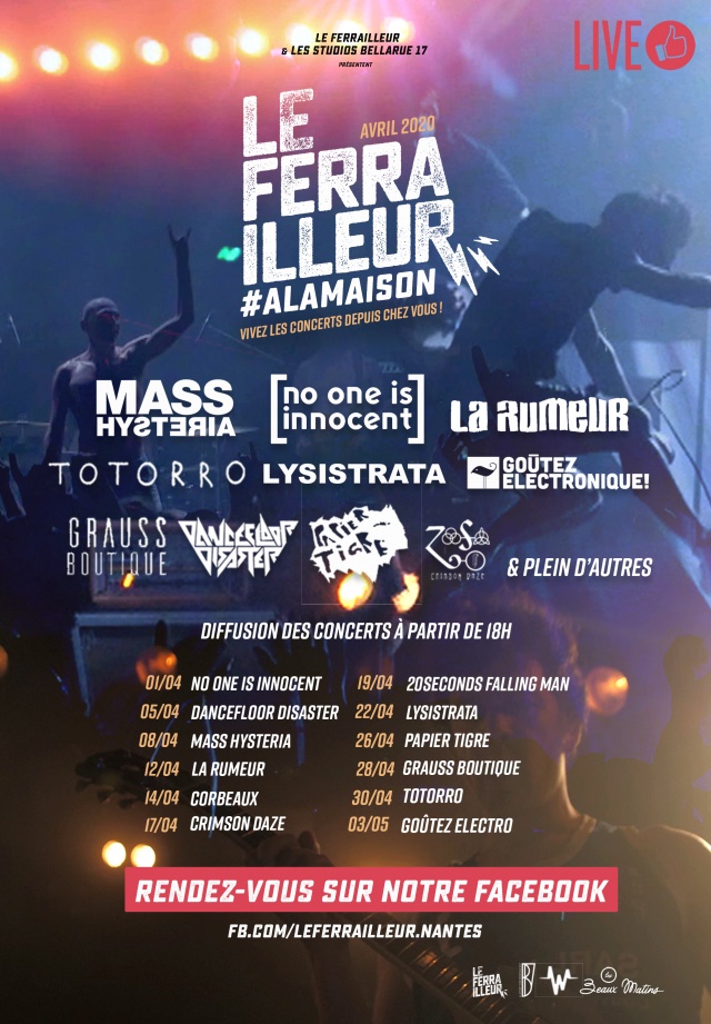 En période de confinement, les concerts nous manquent. L’équipe du Ferrailleur diffuse alors en ligne des concerts qui ont enregistrés par l’équipe vidéo Les Studios Bellarue 17 pour la plupart lors des festivités autour des 10 ans de la salle en mai 2017 : #LeFerrailleurAlaMaison. Au programme des réjouissances : Mass Hysteria, Dancefloor Disaster, No One Is Innocent, La Rumeur, Totorro ou encore Papier Tigre, soit plus une quinzaine d’heures de live stream.