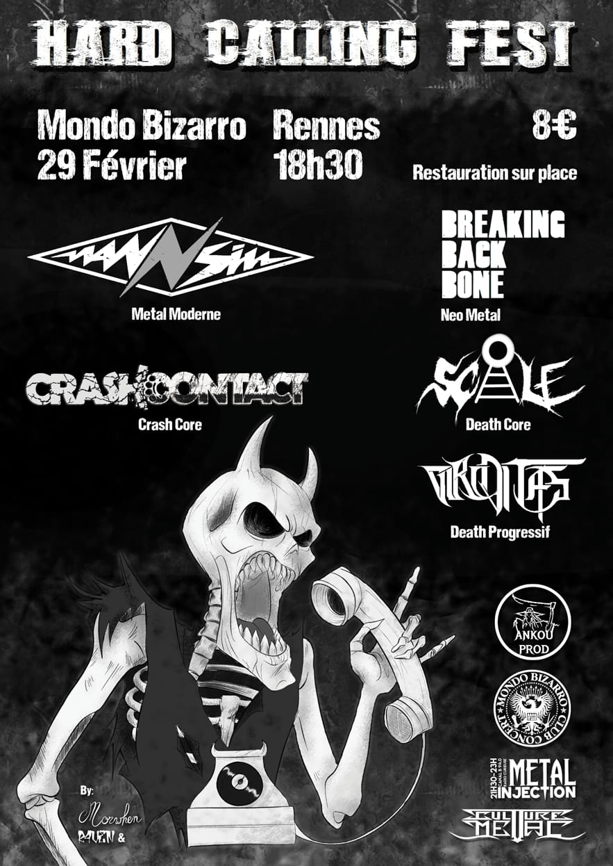 Vous souvenez-vous de l’époque à la fois proche et lointaine des concerts, lorsqu’un groupe se produisait en salle face à un public ? Voici deux mois, le samedi 29 février 2020, la première édition du Hard Calling Festival organisée par le label rennais Hard Calling Records en partenariat avec Culture METAL, avait lieu au Mondo Bizarro à Rennes où cinq groupes bretons se partageaient l’affiche dont les trois groupes signés du label et deux autres groupes invités par le label : Viriditas, Scale, Breaking Back Bone pour les groupes signés du label d’une part et d’autre part Crash Contact et Man’n Sin pour les groupes invités par le label, en têtes d’affiche du festival.