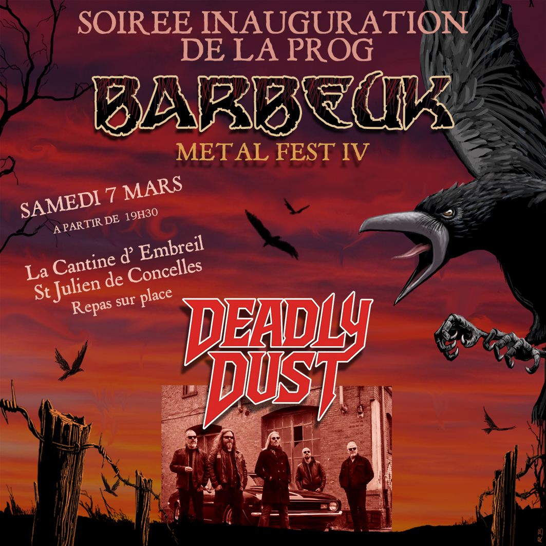 La soirée d’inauguration de la programmation de la quatrième édition du Barbeuk Metal Fest se tiendra le samedi 7 mars dès 19h30 🕢 à la Cantine d’Embreil à Saint-Julien de Concelles (44) en Loire-Atlantique dans les Pays de la Loire ! Le groupe de heavy / hard rock Deadly Dust s’y produira pour l’occasion.